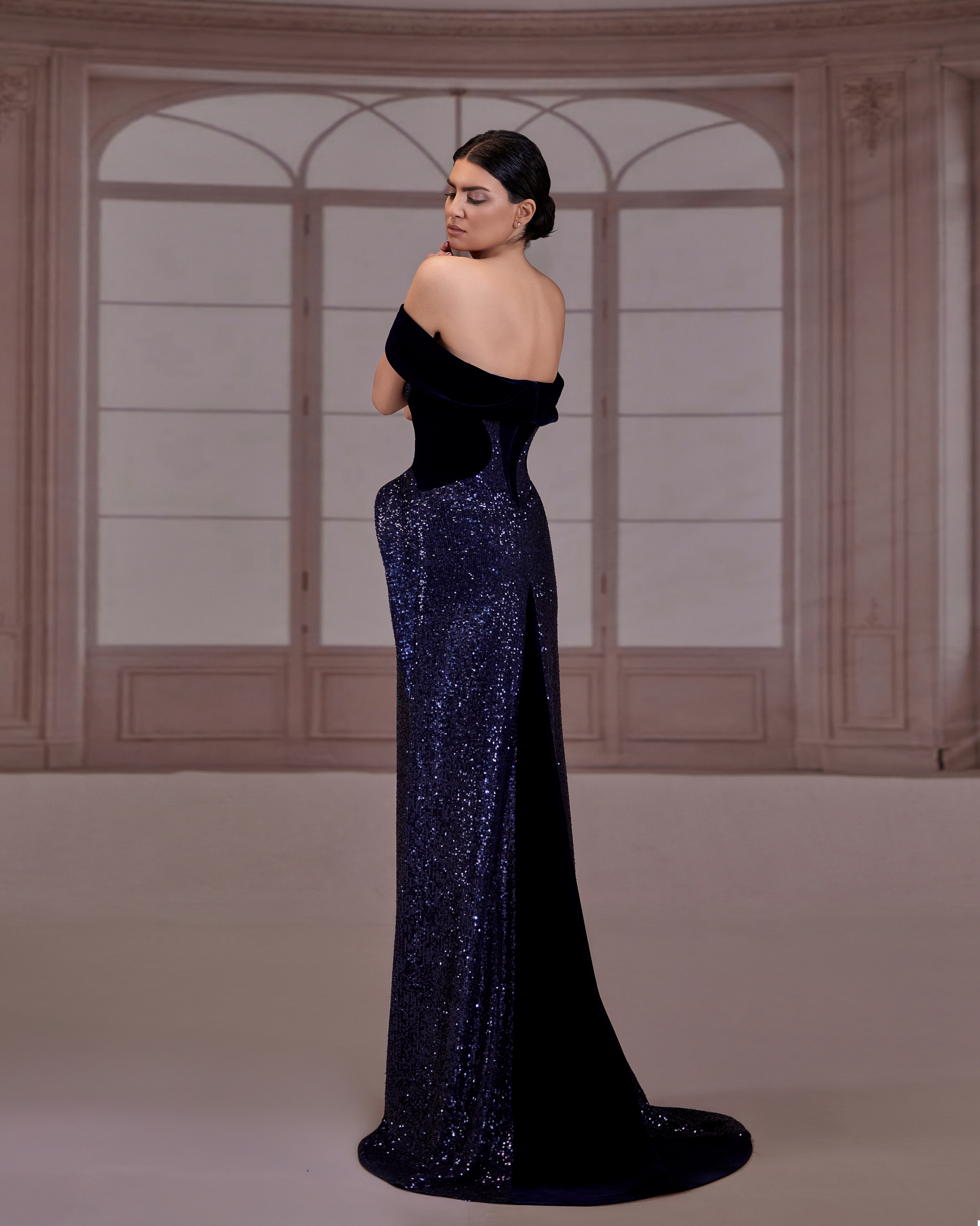 SS264-navy blue dress with a plunging off-the-shoulder neckline