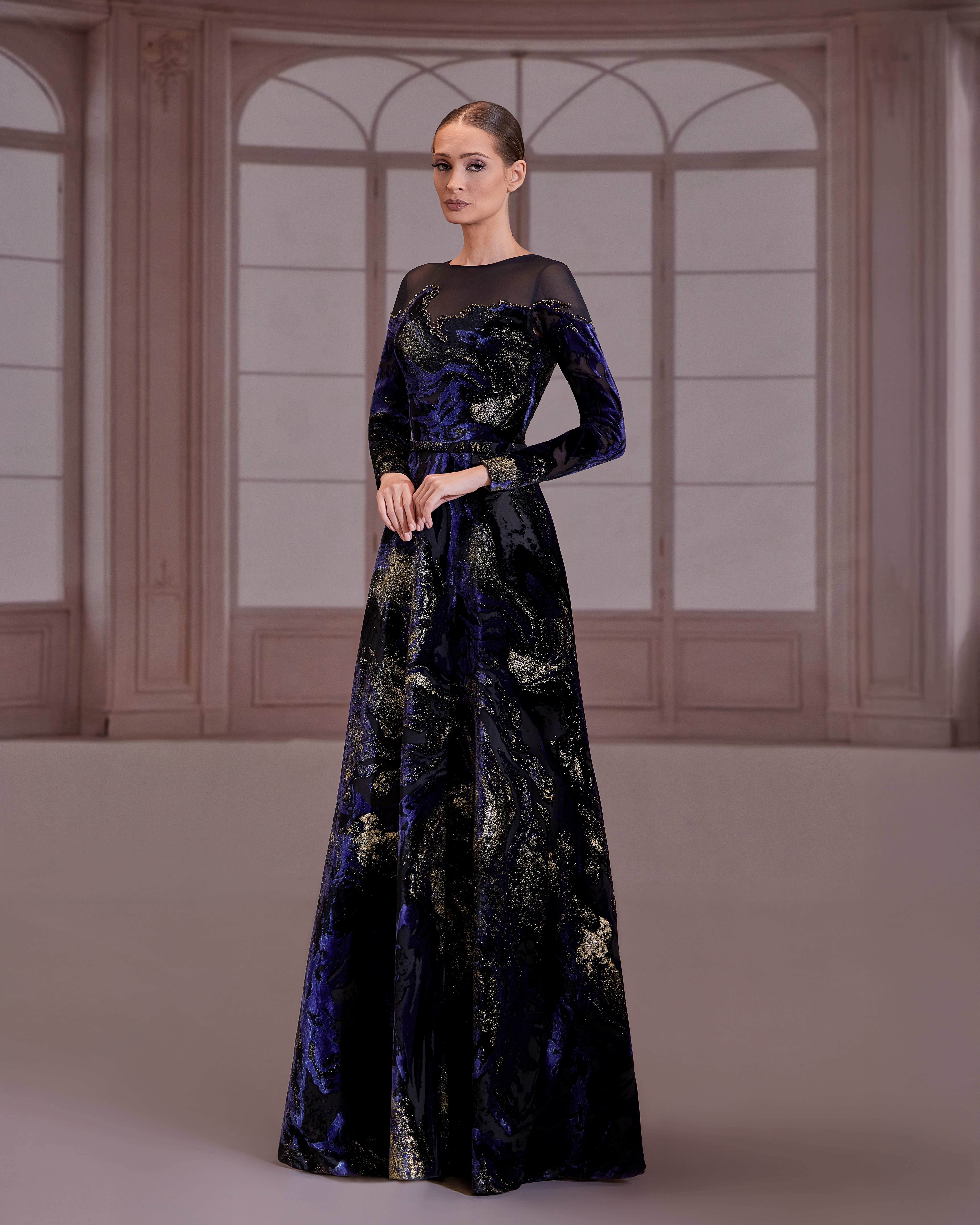 SS266-Navy and gold velvet dress with sheer illusion neckline